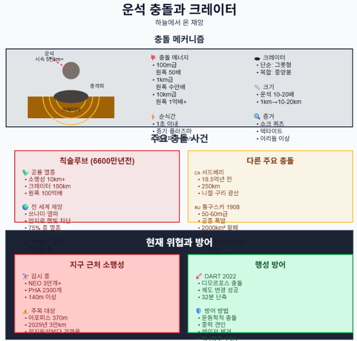 이 글에서는 운석의 종류와 기원, 충돌 메커니즘과 크레이터 형성, 역사상 주요 충돌, 그리고 현재 위협과 대응을 상세히 알아보겠습니다.